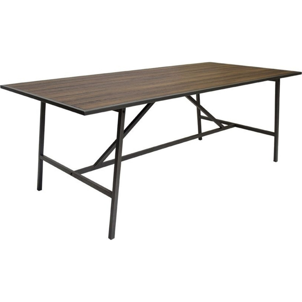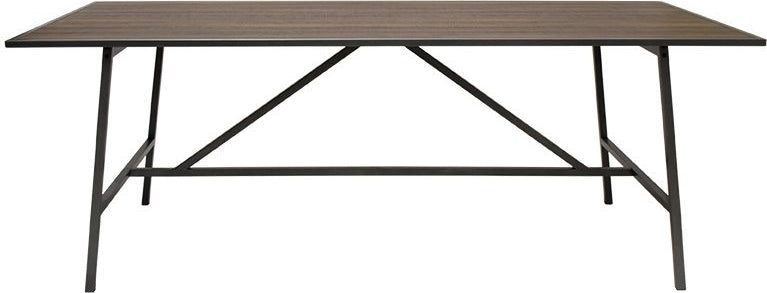 Ett rustikt matbord med en bordsskiva i brunbetsad ekfoliering som ger en levande yta. Kombineras med ett stabilt underrede i svart metall.