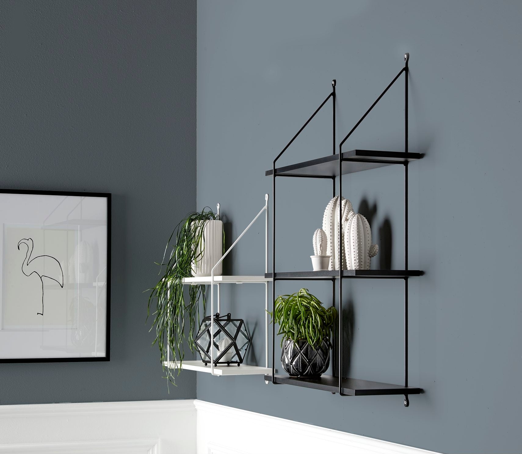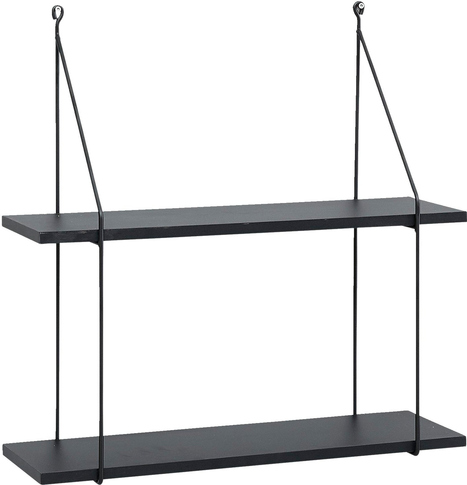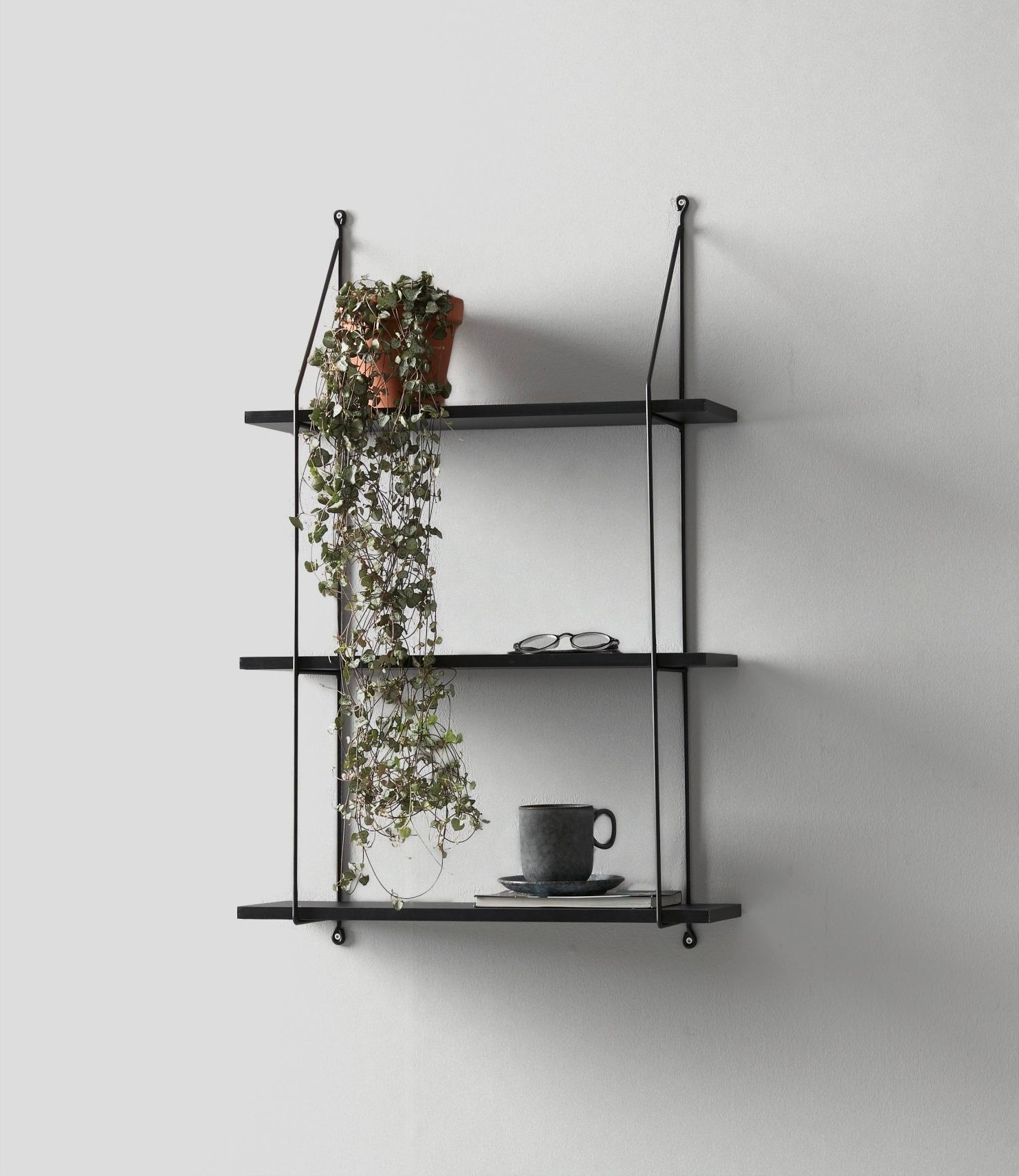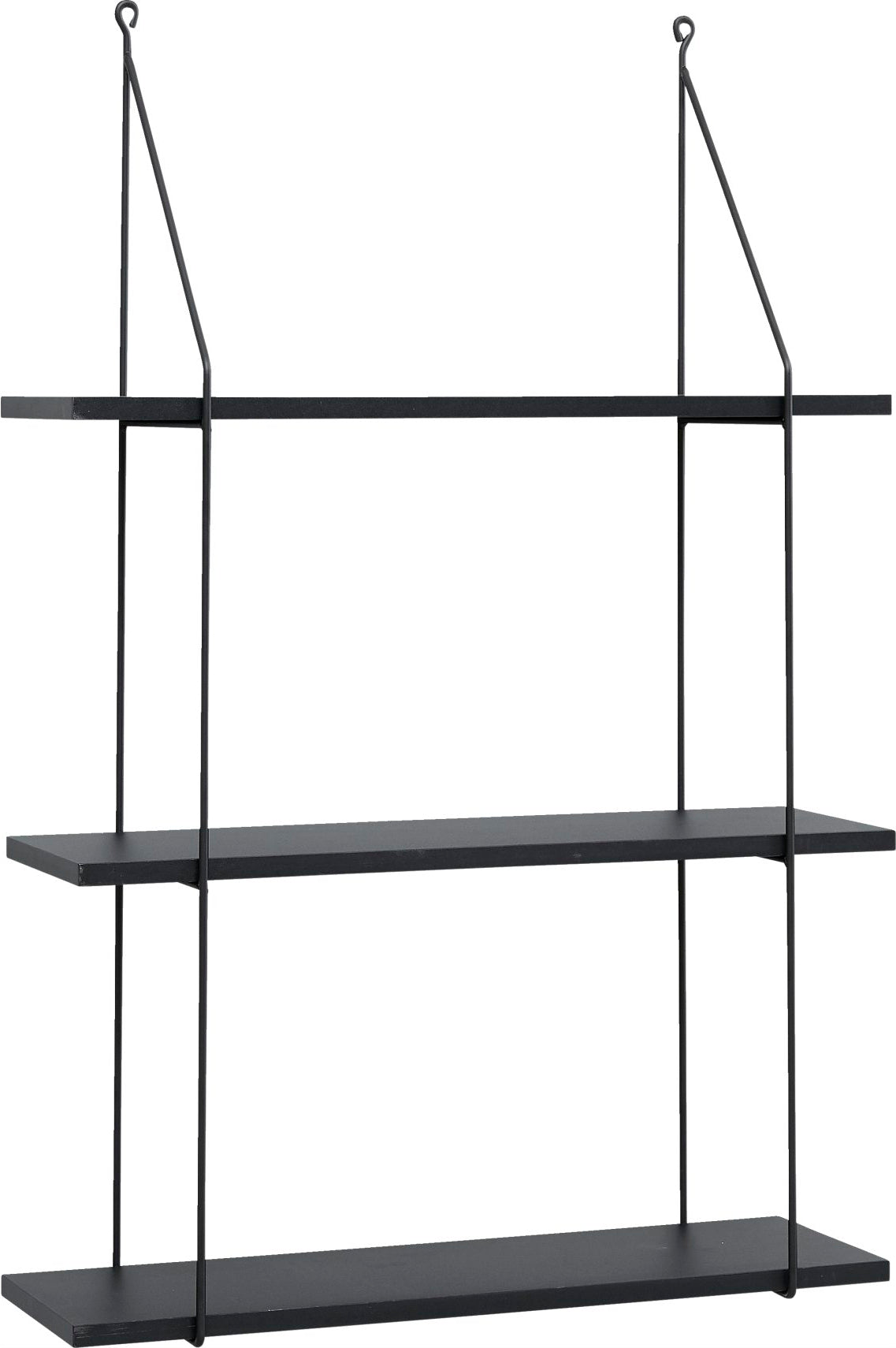 En vägghylla med tre hyllplan i svart melamin och svartlackade metallgavlar.