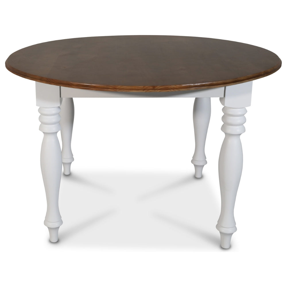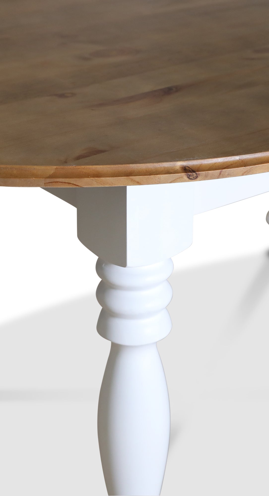 Ett elegant och runt matbord med ett vackert pelarunderrede. Den vita foten kombineras med en toppskiva i brunbetsad askfanér.