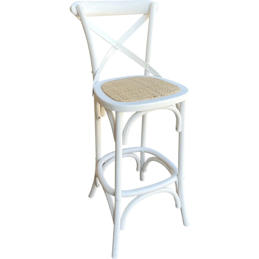 En barstol i vintagestil med vitlackerad stomme av almträ och en sits i naturfärgad rotting.